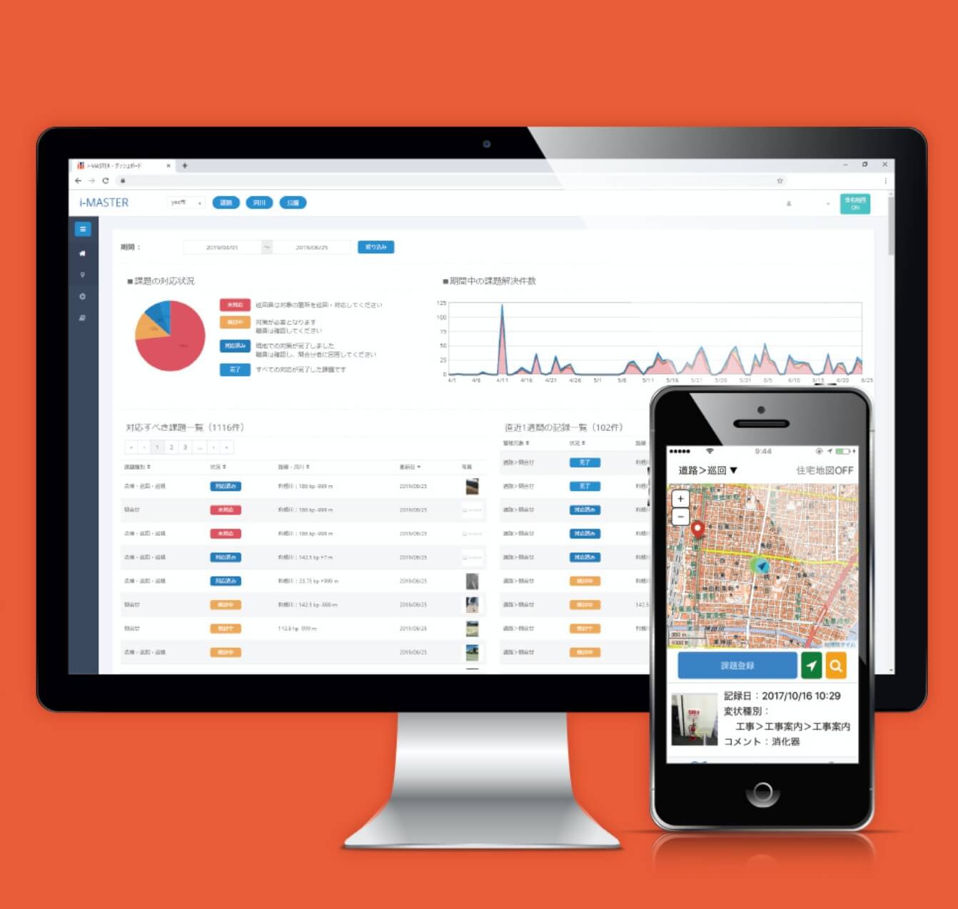地図への地点登録、写真・コメント等の記録、対応状況の確認・報告等の機能により、現場作業の効率化が図れます。また、事務所と現場とのリアルタイムな情報共有によるタスク状況の見える化や、データの蓄積、日報の自動作成等の機能により、スムーズなタスク管理や日々の業務の省略化を実現いたします。